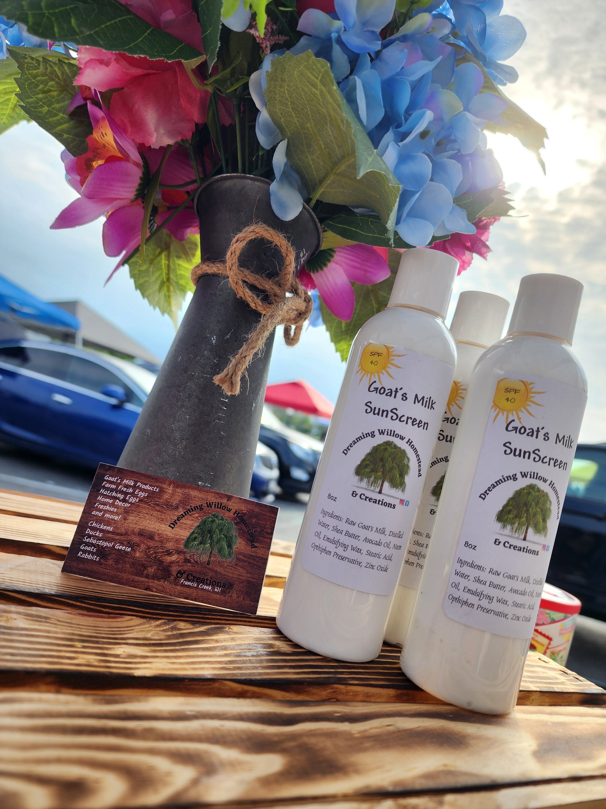 Using Raw Goat's Milk as our first ingredient, this lotion is a true game changer to skin care and Sun protection! We took our Unscented Goat's Milk Lotion recipe, along with Zinc Oxide for the added Sun Protection, combined you have a great all natural Sun Screen with an SPF 40